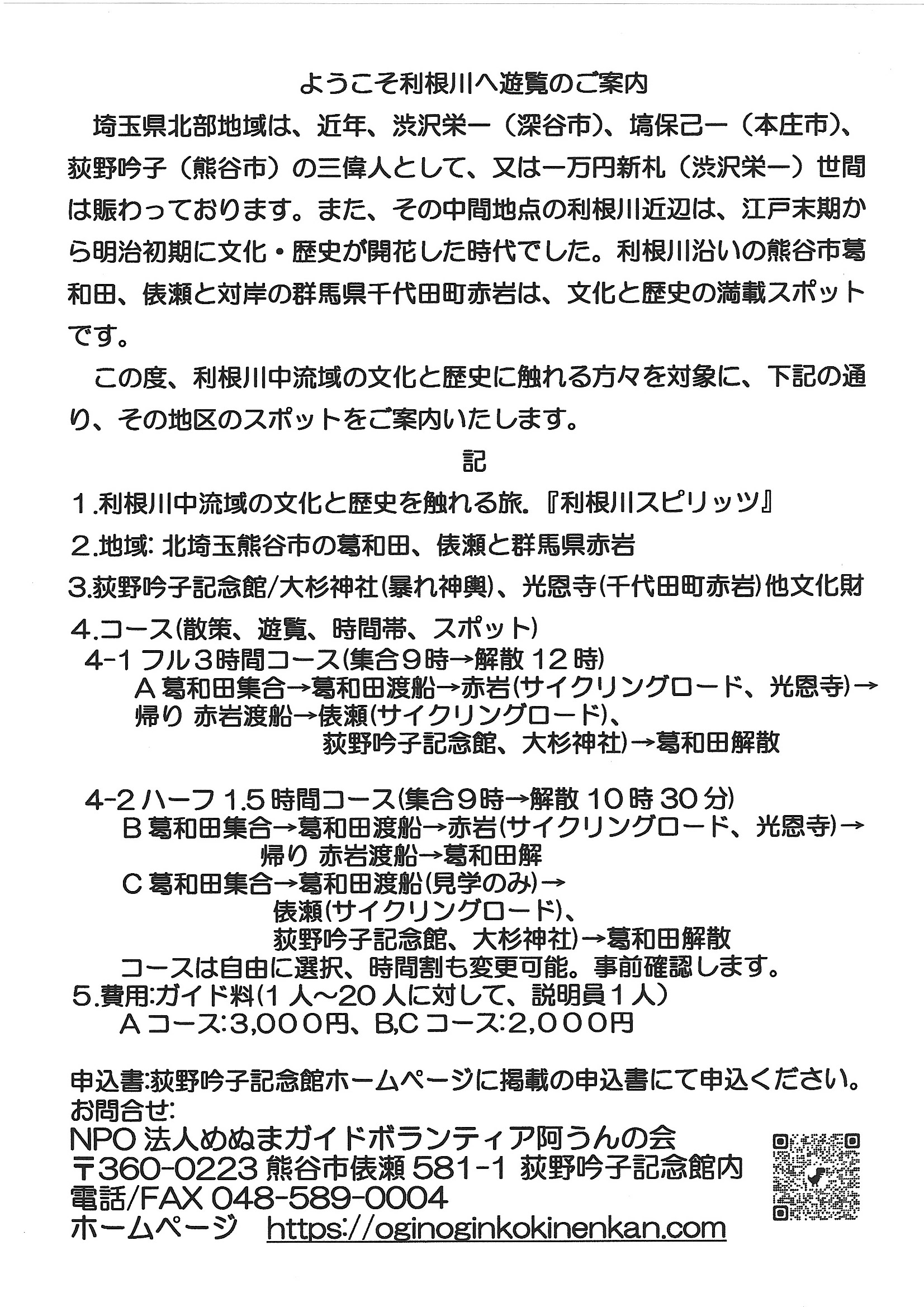 ●NPO法人阿うんの会 設立5周年記念講演会のお知らせ。来る5月29日午後2時より、妻沼中央公民館にて、熊谷市教育委員会 社会教育課 市史編纂室主査 蛭間健悟先生をお招きし、記念講演会「荻野吟子その歩みと出会い」を開催します。皆様ご自由に参加下さい。2023.04.25
